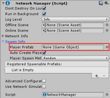 Add your player prefab to the the Network ManagerA Networking component that manages the network state of a Project. More info