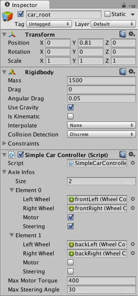 Create a new C# script (Add Component > New Script), on the car_root GameObject, copy this sample into the script file and save it. You can tune the script parameters as shown below; experiment with the settings and enter Play Mode to test the results.