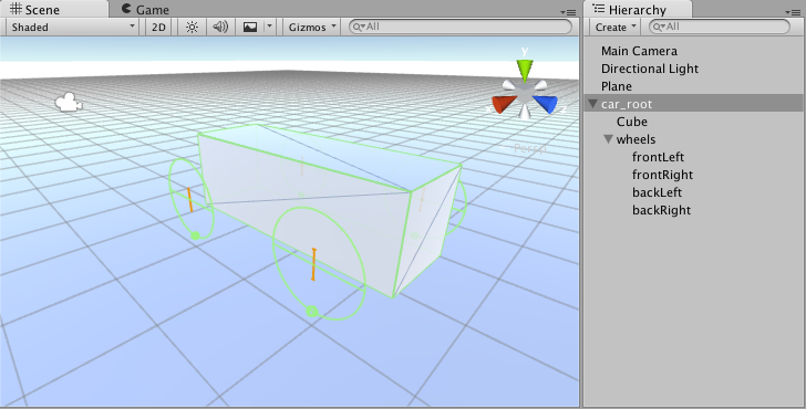 8. Finally, select the car_root GameObject and use the Move Tool to raise it slightly above the ground.