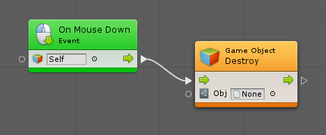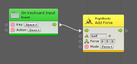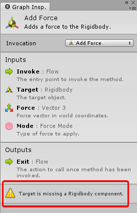When you use nodes that require components and pass a game object or component that does not have the specified component, the node will be colored yellow as a warning. For example, here, even though we are providing default values for each value input of the Add Force unit, Bolt detects that the owner game object does not have a rigidbodyA component that allows a GameObject to be affected by simulated gravity and other forces. More info