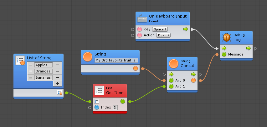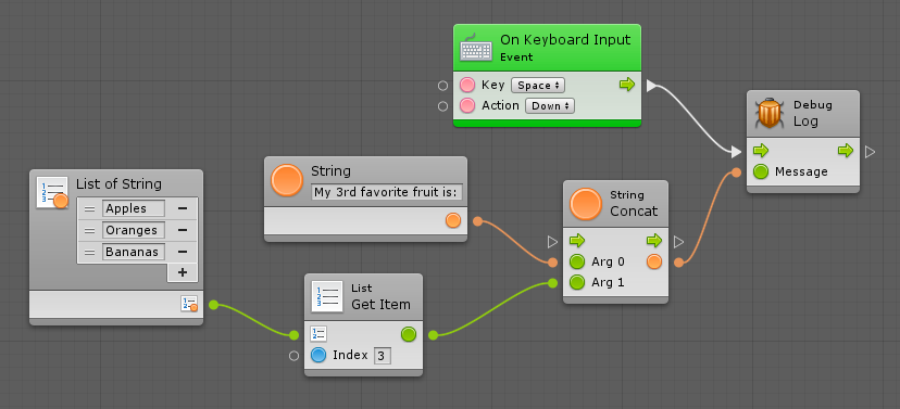Let’s take a look at a faulty graph. Here, we’re trying to log our third favorite fruit to the console when we press space. (Surely this is an example that could apply to a game… right?)