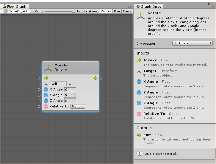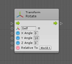 Let’s look at the anatomy of a unit. In this example, we created a Rotate Transform unit, which you can find under Codebase > Unity Engine > Transform > Rotate (X, Y, Z, Relative To)
