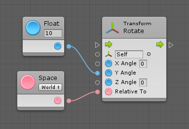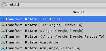 For example, the Rotate Transform unit has 6 overloads. Two of them take the angles as a single euler angle vector, two other take it as 3 separate float components in X / Y / Z, and the last two take it as an angle relative to the axis. In each pair, one allows to specify the relative space, while the other just assumes that you’re specifying angles in world space. Here’s a screenshot of all 6 overloads for the rotate unit: