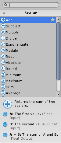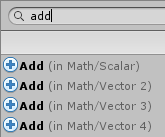 To display the fuzzy finder, simply right-click anywhere in the empty grid. You can then browse through the categories or search in the top field to quickly find a unit. Here, for example, we’re adding a simple scalar addition (float + float) unit with both methods: