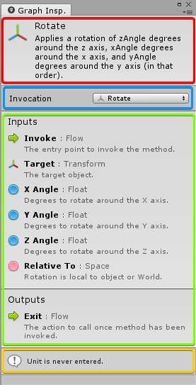 The top part of a unit is its header. It’s a quick summary of what the unit does. In this case, it tells us that it is invoking the Rotate method on a Transform componentA Transform component determines the Position, Rotation, and Scale of each object in the scene. Every GameObject has a Transform. More info