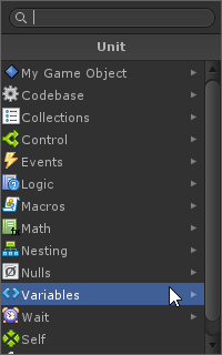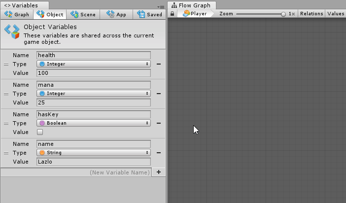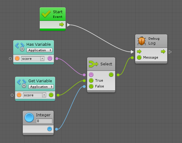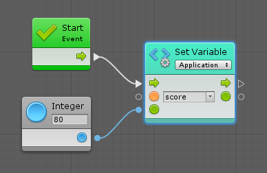 Because the Name of the variable is a standard value input port, you can connect it to any other port that returns a string. This means that you can refer to “dynamic variables”, that is, variables whose reference may change during play mode.