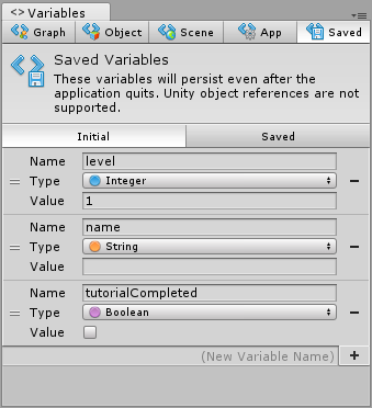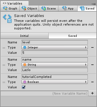 | Saved Variables | Saved variables will persist even after the application quits. They can be used as a simple but powerful save system. They are saved in Unity’s player prefs, which means they unfortunately can’t refer to Unity objects like game objects and components. |