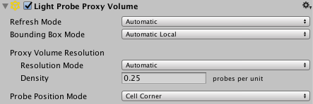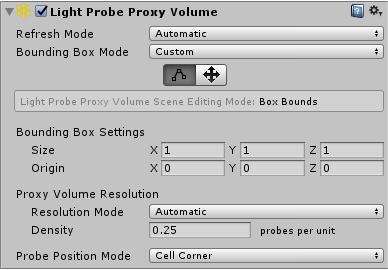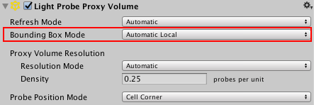 | Automatic Local (default value) | A local-space bounding box is computed. The interpolated Light Probe positions are generated inside this bounding box. If a Renderer component isn’t attached to the GameObject, then a default bounding box is generated. The bounding box computation encloses the current Renderer, and sets all the Renderers down the hierarchy that have the Light Probes property to Use Proxy Volume. |