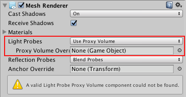 See in Glossary property to Use Proxy Volume, the GameObject must have a Light Probe Proxy Volume (LPPV) component attached. You can add a LPPV component on the same GameObject, or you can use (borrow) a LPPV component from another GameObject using the Proxy Volume Override property. If Unity cannot find a LPPV component in the current GameObject or in the Proxy Volume Override GameObject, a warning message is displayed at the bottom of the Renderer.