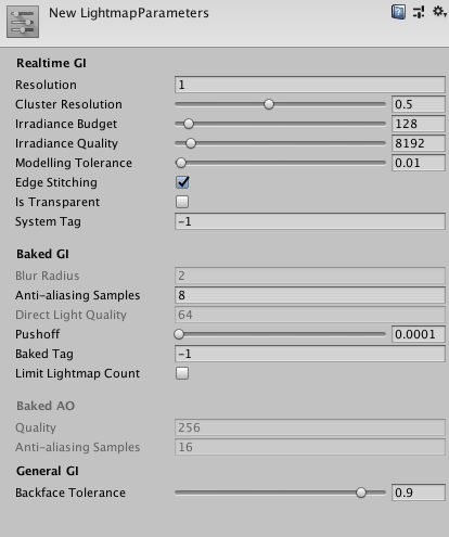 See in Glossary Parameters Asset contains a set of values for the parameters that control Unity’s lighting features. These Assets allow you to define and save different sets of values for lighting, for use in different situations.