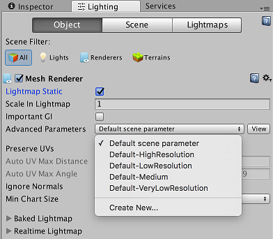 Lightmap Parameters Assets allow you to quickly create presets optimized for different types of GameObjectsThe fundamental object in Unity scenes, which can represent characters, props, scenery, cameras, waypoints, and more. A GameObject’s functionality is defined by the Components attached to it. More info