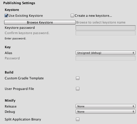 Note: For security reasons, Unity doesn’t save the passwords on this page. The unsigned debug keystore is located by default at ~/.android/debug.keystore on MacOS and %USERPROFILE%\.android\debug.keystore on Windows.