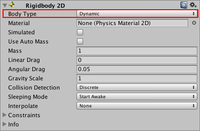 | Body Type | Set the RigidBody 2D’s component settings, so that you can manipulate movement (position and rotation) behavior and Collider 2D interaction. Options are: Dynamic, Kinematic, Static |