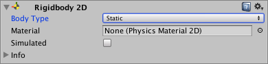 There are three options for Body Type; each defines a common and fixed behavior. Any Collider 2D attached to a Rigidbody 2D inherits the Rigidbody 2D’s Body Type. The three options are: