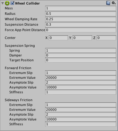 | Forward/Sideways Friction | Properties of tire friction when the wheel is rolling forward and sideways. See the Wheel Friction Curves section below. |