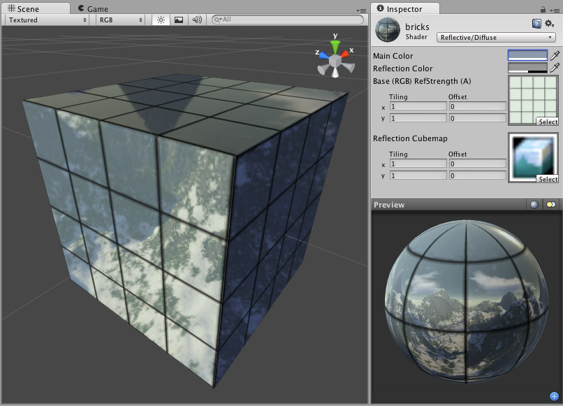 which will define what exactly is reflected. The main texture’s alpha channel defines the strength of reflection on the object’s surface. Any sceneA Scene contains the environments and menus of your game. Think of each unique Scene file as a unique level. In each Scene, you place your environments, obstacles, and decorations, essentially designing and building your game in pieces. More info