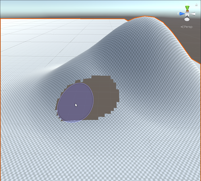 To paint holes, click and drag the cursor across the Terrain. To erase holes from the Terrain, click and drag while holding down the Shift key. Use the Brush Size slider to control the size of your tool. The Opacity slider determines the strength of the Brush when you apply it to the Terrain.