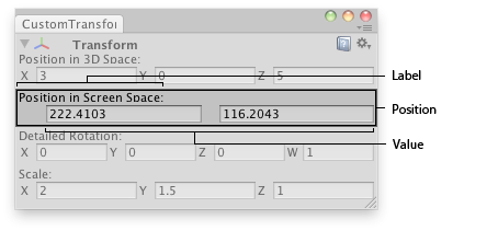 EditorGUI.Vector2Field(new Rect(3, 50, position.width - 6, 20), "Position in Screen Space:", Camera.main.WorldToScreenPoint(currObj.position));