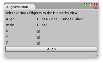 public class Example : EditorWindow { bool alignToX = true; bool alignToY = true; bool alignToZ = true; string selected = ""; string alignTo = "";