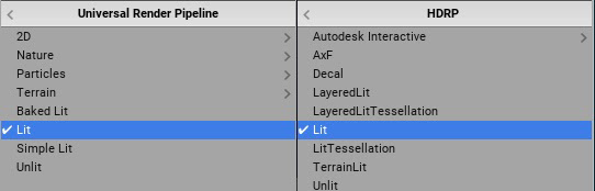 Note that URP and HDRP are in active development, and new features are frequently added. See the latest versions of the URP documentation and the HDRP documentation for further information.