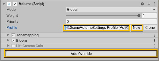 1. Configure the Volume Profile by adding overrides for the desired post-processing effects.