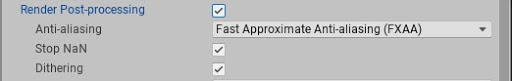 2. URP only: Select the Camera your application uses and make sure “Render Post Processing” is enabled. You can enable Anti-Aliasing for the in game camera without adding additional components.