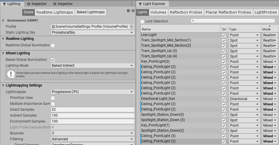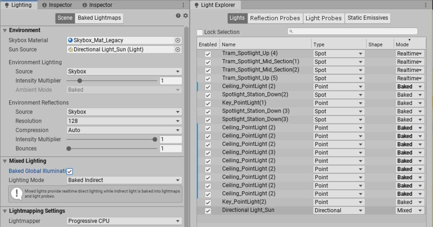 • Most Lights have their Mode set to Baked; a minimal number of Lights have their Mode set to Realtime.