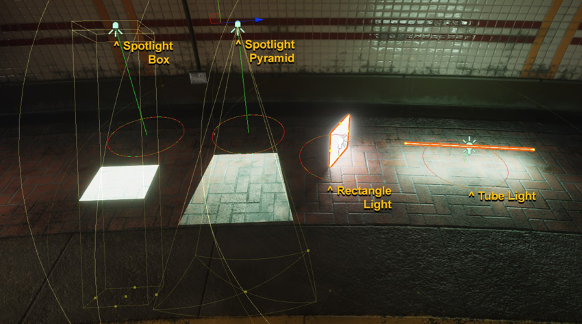 • HDRP supports additional Light types, such as Spotlight Pyramid/Box, Realtime Tube, and Realtime Rectangular lights. These can help you achieve different realistic effects.
