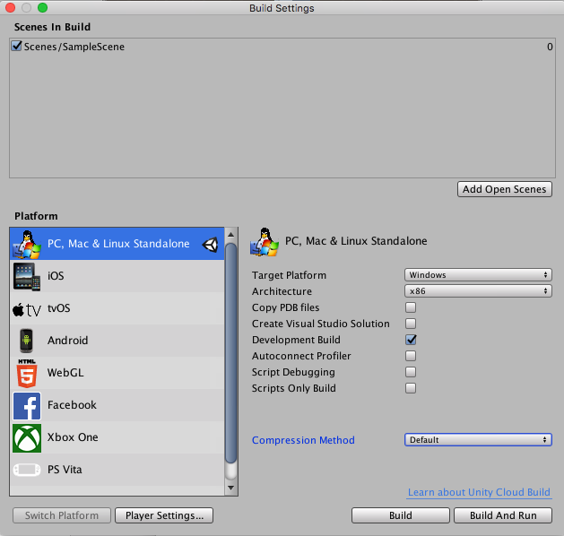 Go to File > Build Settings, and under Platform, select PC, Mac & Linux Standalone. Set the Target Platform to Windows, set the Architecture to x86_64, and click the Development BuildA development build includes debug symbols and enables the Profiler. More info