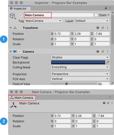 See in Glossary open in a regular Inspector (1), and its Transform component open in a focused Inspector (2). Notice that the focused Inspector’s tab header displays the name of the GameObject that the component belongs to.
