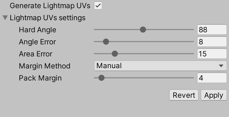| Calculate | Based on expected lightmap resolution and object scale, Unity calculates a Pack Margin just large enough to avoid UV overlaps. | |