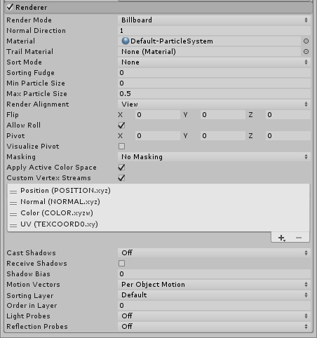 | Custom Vertex Streams | Configure which particle properties are available in the Vertex ShaderA program that runs on each vertex of a 3D model when the model is being rendered. More info See in Glossary of your Material. See Particle Vertex Streams for more details. |