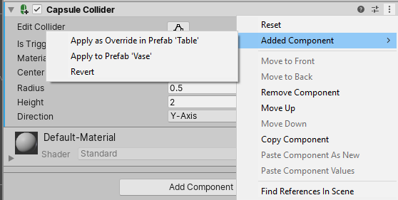 And, if you choose Apply as Override in Prefab ‘Table’, the value becomes an override on the instance of ‘Vase’ that is inside the ‘Table’ Prefab. The property is no longer marked as an override on the instance in the Scene, but if you open the ‘Table’ Prefab in Prefab Mode, the property on the ‘Vase’ Prefab instance is marked as an override there.