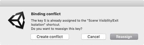 When you’re working in Unity, using a shortcut that is assigned to conflicting commands opens the Shortcut Conflict dialog.