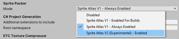 To enable the experimental Sprite Atlas v2 mode, go to Edit > Project Settings > Sprite Packer, open the Mode drop-down menu and select Sprite Atlas V2 (Experimental) - Enabled.