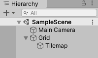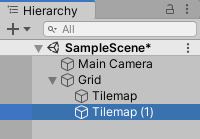 After selecting the Tilemap option, a new Grid GameObject is created with a child Tilemap GameObject in the sceneA Scene contains the environments and menus of your game. Think of each unique Scene file as a unique level. In each Scene, you place your environments, obstacles, and decorations, essentially designing and building your game in pieces. More info