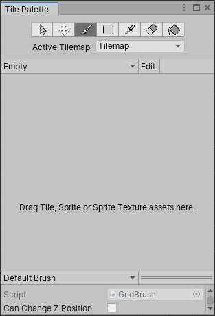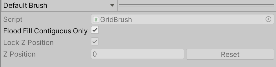 | Script | Displays the currently assigned script Asset that provides a fixed set of APIs for Tilemap painting. The default is the GridBrush. Users may use or create their own Scriptable Brushes which become available from the drop-down menu. The Script property updates to reflect the current active Brush. |