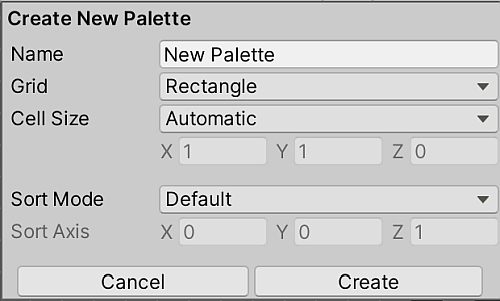 Name the newly created Palette and select the desired settings, then select the Create button. Select the folder to save the Palette Asset file into when prompted. The newly created Palette is automatically loaded in the Tile Palette window.