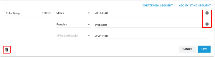 4. To delete a value for a particular segment, click the minus button to the right of the edit view and then click Save. (You cannot delete the default All Users value.)