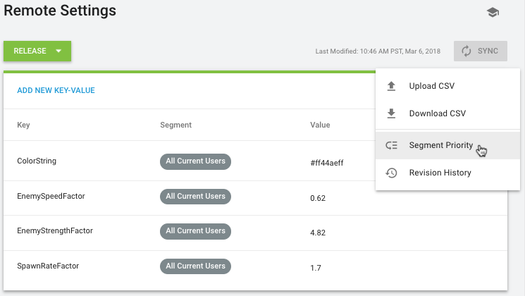 Each Remote Setting consists of a key, a default value, and, optionally, segmented values. When a setting contains segmented values, the segments that the current player is in determine which values are included in the configuration. If more than one segment applies, the configuration includes the value from the highest priority segment.
