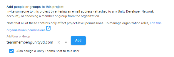 Unity launches the Users section of the Unity Developer Dashboard in your browser. From the Users section, you can invite anyone with a Unity ID to join your project: