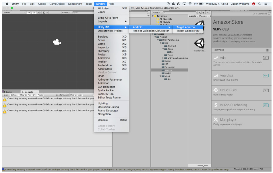 2. Set the IAP target store. You should already have an Android app set up. Set the target store using Unity IAP’s Window > Unity IAP > Android > Target Amazon menu item. This is used to toggle between Google, Amazon, and other Android stores.