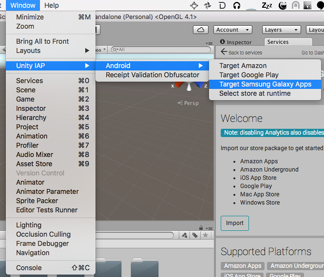 1. To set the IAP target store in the Unity Editor, go to Window > Unity IAPAbbreviation of Unity In App Purchase