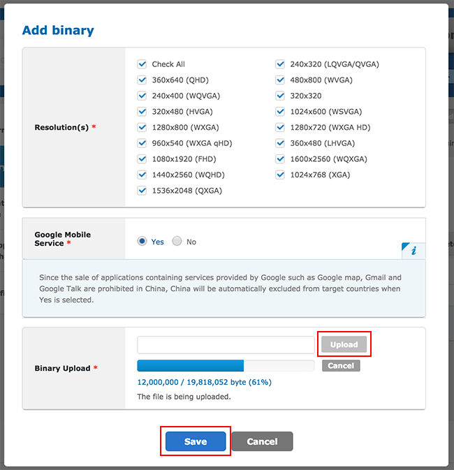 Populate the device characteristics in Resolution(s) and Google Mobile Service, upload your APK (the one you created above in the “Getting Started” section) in Binary upload, then click Save.