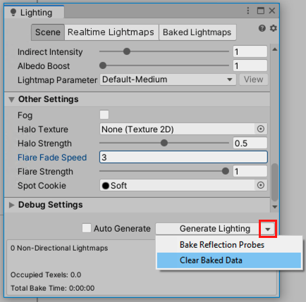 2. In Debug Settings, click the drop-down menu on the Generate Lighting button, then click Clear Baked Data.