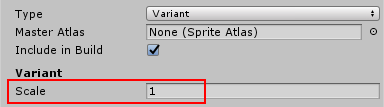 A Variant Sprite Atlas scales the Textures it gets from its Master Atlas via its Scale property. The resolution of the Variant Atlas’ Texture is the result of the Master Atlas’ Texture multiplied by the Scale factor.