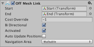 | Auto Update Positions | When enabled, the Off-Mesh link will be reconnected to the NavMesh when the end points move. If disabled the link will stay at its start location even if the end points are moved. |