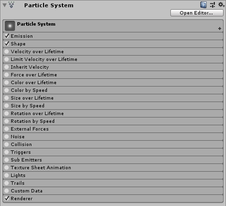 See in Glossary organises them into collapsible sections called “modules”. These modules are documented in separate pages. See documentation on Particle System Modules to learn about each one.