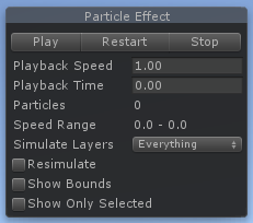 | Show Only Selected | When this property is enabled, Unity hides all non-selected Particle Systems, allowing you to focus on producing a single effect. |