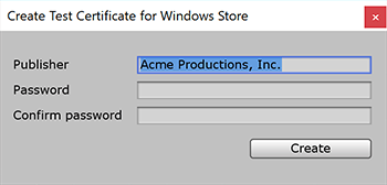 Click the Create button. The Create Test Certificate for Windows Store dialog window appears.